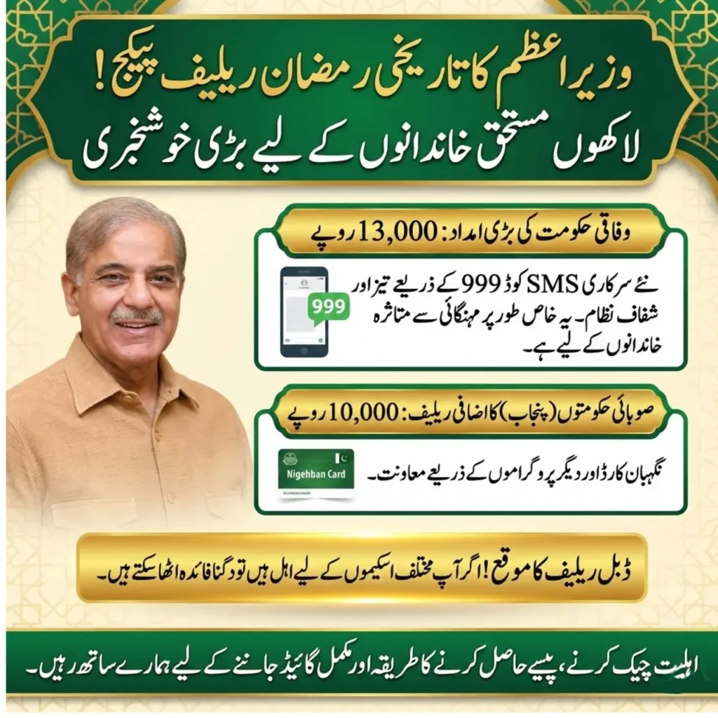 Prime Minister Shehbaz Sharif has announced one of the biggest Ramzan relief initiatives in Pakistan’s history, bringing financial support to millions of deserving families. Under this major program, eligible households can receive Rs. 13,000 through a new government SMS system using short code 999, making the process faster and more transparent. Yeh package khas tor par un gharano ke liye hai jo mehngai ki wajah se mushkilat ka samna kar rahe hain.